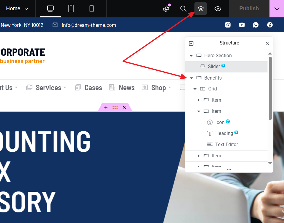 To start creating new layout click “Edit with Elementor” button (see fig. 2). It will bring you to the editor screen (fig. 1). It is easy to navigate among the widgets using Navigator tool (fig. 3):