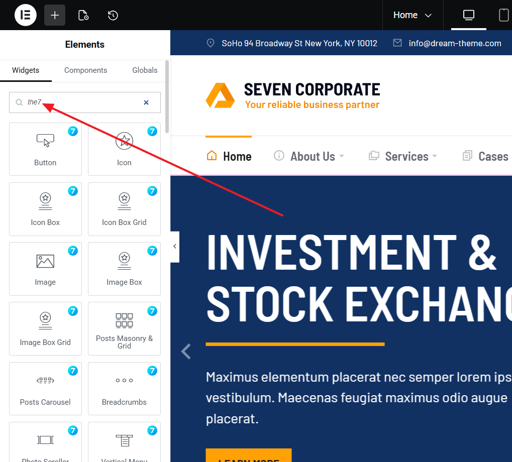 You can find available Elementor widgets by clicking on the dotted square icon in the right upper corner (fig. 4). You can also filter theme-based widgets by searching “the7” keyword there: