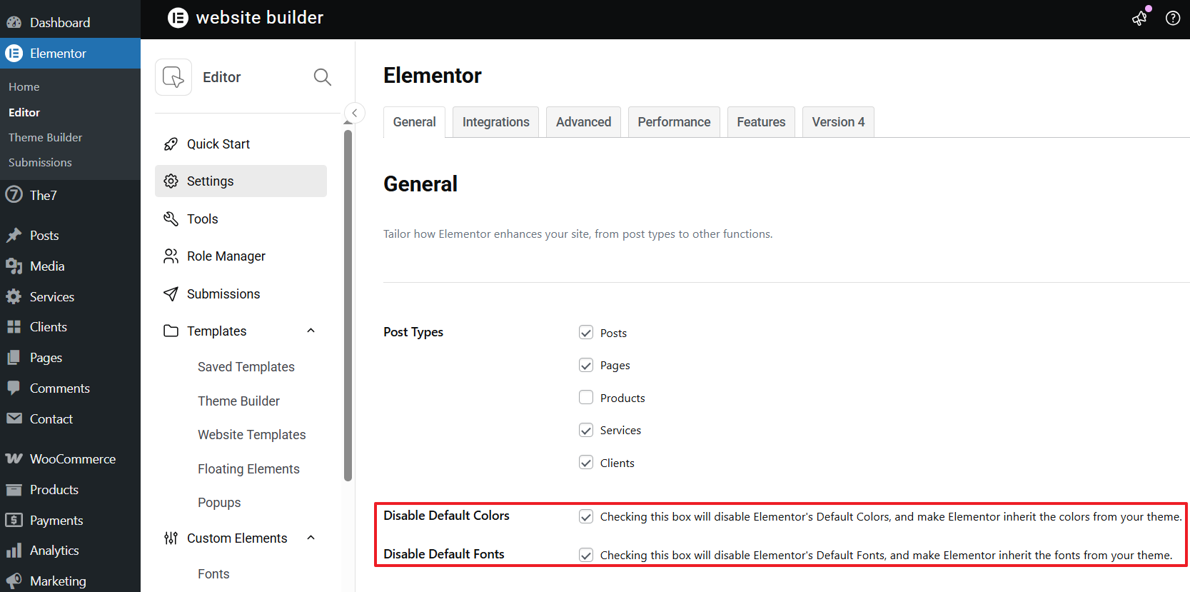 Such configuration disables native Elementor’s stylesheets for widgets design and applies The7 styles only. If Elementor’s Default colors and fonts are not disabled, the font styles will be as per the settings from Elementor Editor’s Panel > Elementor Logo Menu > Site Settings (fig. 2). You can read more about it here https://elementor.com/help/site-settings/.