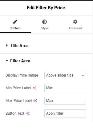 In the “Filter Area” tab (fig. 1.2), you can choose the Price range display potion : Above slider tips or Next to button.