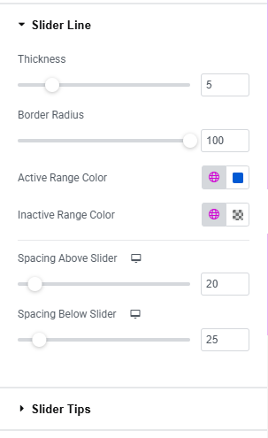 “Slider Line Area” tab (fig. 2.2) allows to adjust the appearance of the Slider Line such as Slider Thickness, Border radius, Active and inactive range color, spacing above and below the Slider line.