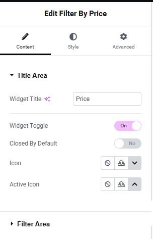 You can enable/disable the title under the “Title Area” tab (fig. 1.1), make the widget a toggle and set toggle icons: