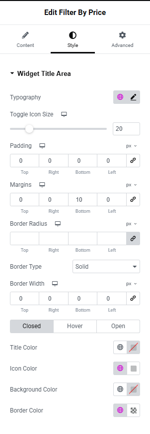 - colors for closed/hover/active states (for the title, icon, background and border).