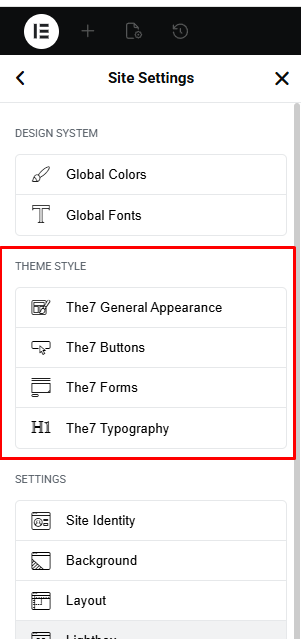 Since ver. 10.0, theme settings can be configured through Elementor interface. New The7 users have this featured turned on by default. Existing users can enable it by referring to The7 -> Settings (fig. 2):